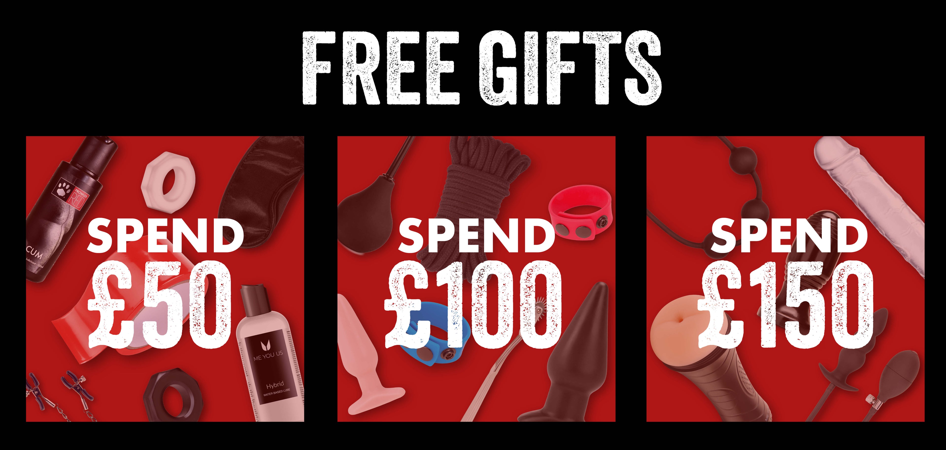 From cock rings to lubes, bondage tape to nipple clamps, it's a thank you from us for shopping at RED.